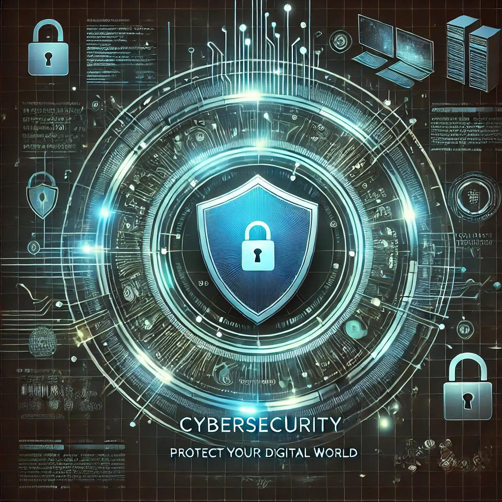 The cybersecurity poster presents a sleek, futuristic atmosphere. At its center, a glowing shield stands as the symbol of protection, surrounded by abstract lines of code and vibrant data streams flowing in circular patterns. These elements evoke a sense of constant vigilance and high-tech security, while the dark grid background, faintly outlined with servers, locks, and computers, subtly reminds of the digital threats lurking. The color palette of dark blues and neon greens reinforces the modern, cutting-edge feel, with the metallic accents adding a layer of sophistication. Bold text at the top reads "Cybersecurity: Protect Your Digital World," underscoring the theme of safeguarding the digital realm. The overall aesthetic speaks to both the strength and elegance of modern cybersecurity measures.