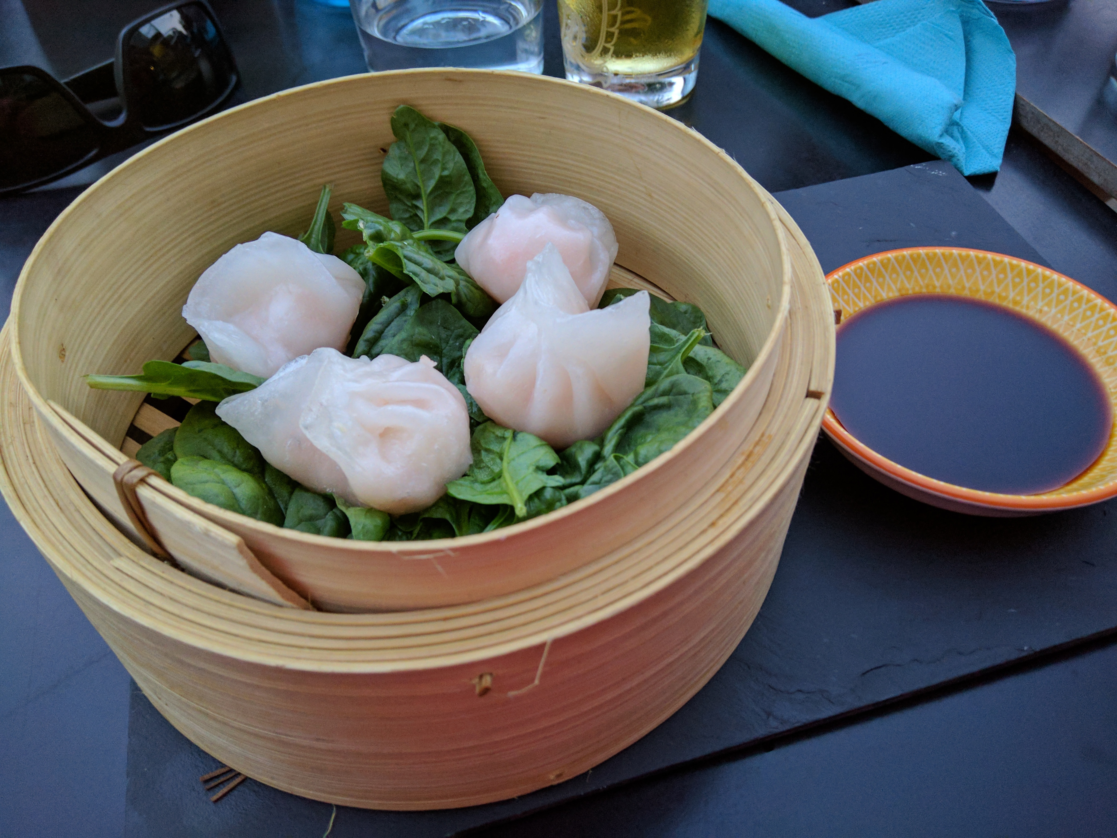 The first image features a bamboo steamer basket filled with delicate dumplings resting on a bed of fresh spinach. The dumplings are translucent, their soft, doughy skins revealing the slightly pink filling within. The steamer's bamboo layers lend a rustic, authentic touch, suggesting a freshly made, steamy offering of dim sum. Next to the basket is a small dish of soy sauce, its dark brown color glistening against the orange and yellow geometric pattern of the dish. The scene captures the simple elegance of a traditional dim sum dish, poised for dipping.