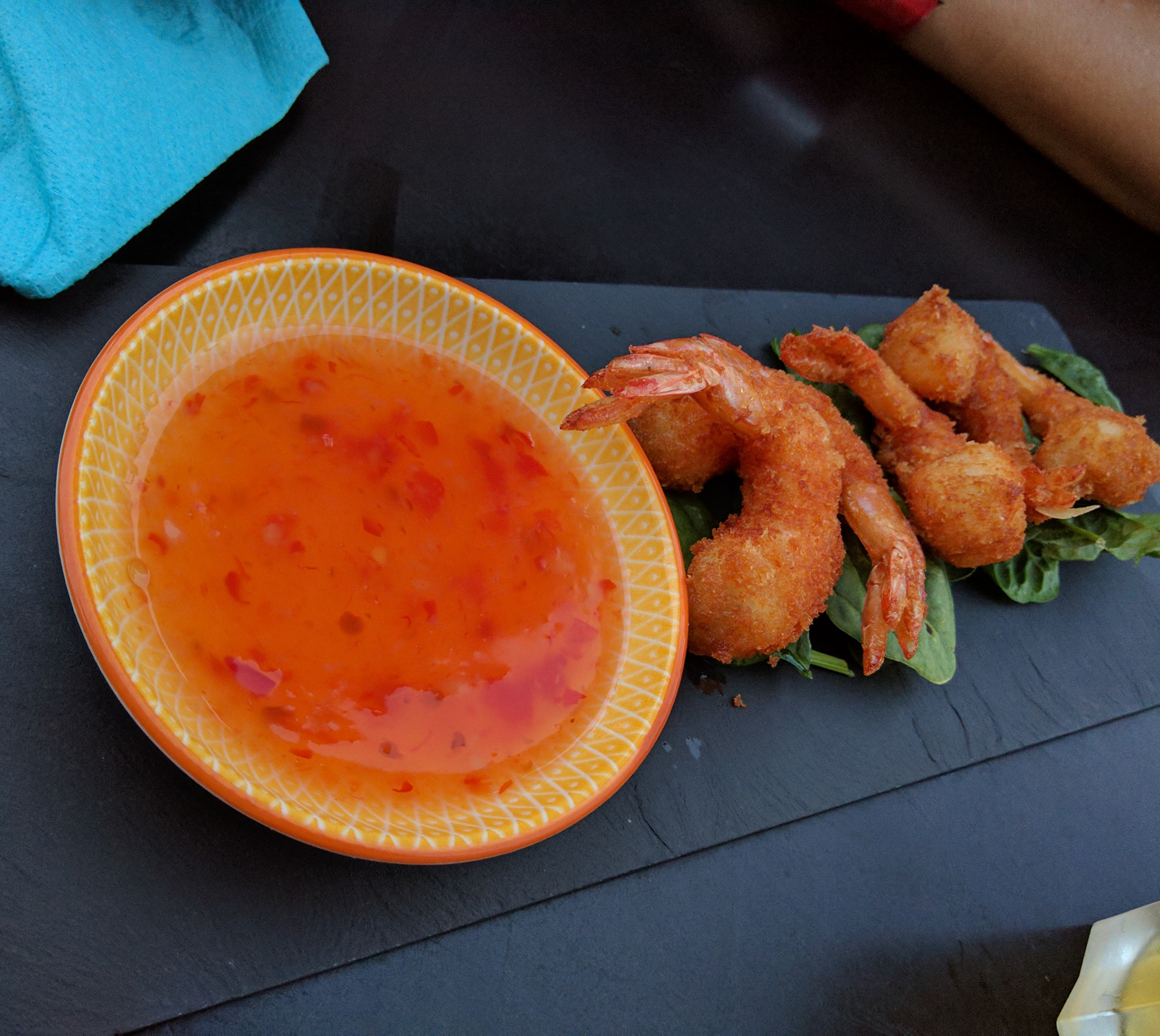 In the second image, golden-fried shrimp sit on a slate plate, their crispy, breaded coating contrasting beautifully with their vivid orange tails. They rest on a garnish of green leaves, providing a burst of color. Beside the shrimp is a small, vibrant bowl filled with sweet chili dipping sauce, its glossy, deep red hue speckled with chili flakes. The combination of the crunchy shrimp and the spicy-sweet sauce suggests a dish bursting with flavor and texture, perfect for a quick bite or shared snack in a cozy dining setting.