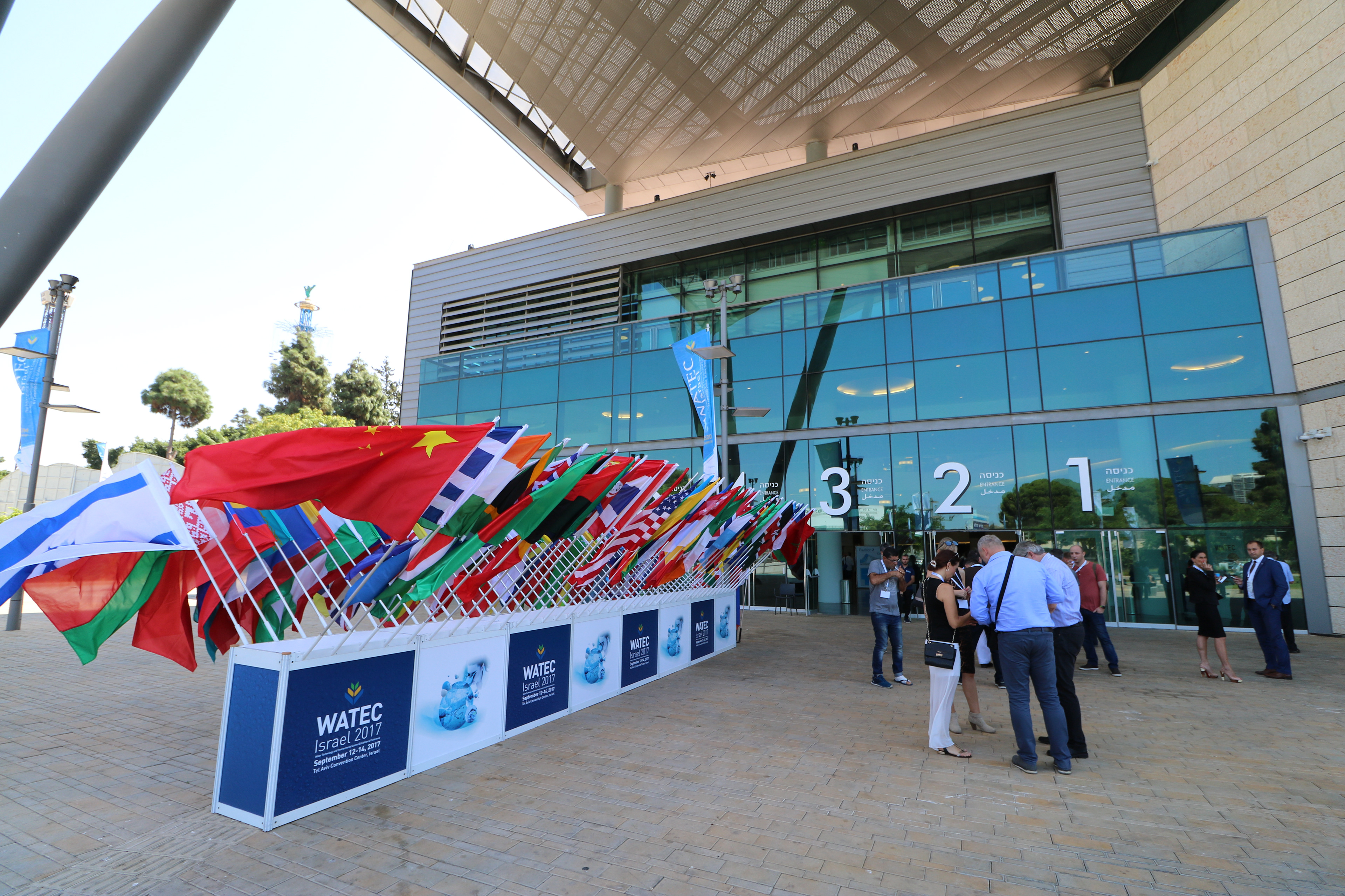 Overhead, a large canopy provides shade, adding to the sophisticated architecture of the venue. The surrounding greenery and the bright, clear sky lend an outdoor element to the otherwise urban setting. There is also signage indicating the WATEC Israel 2017 event, further emphasizing the water-centric focus of the conference. The entire scene portrays an energetic convergence of innovation and global cooperation in water technology.