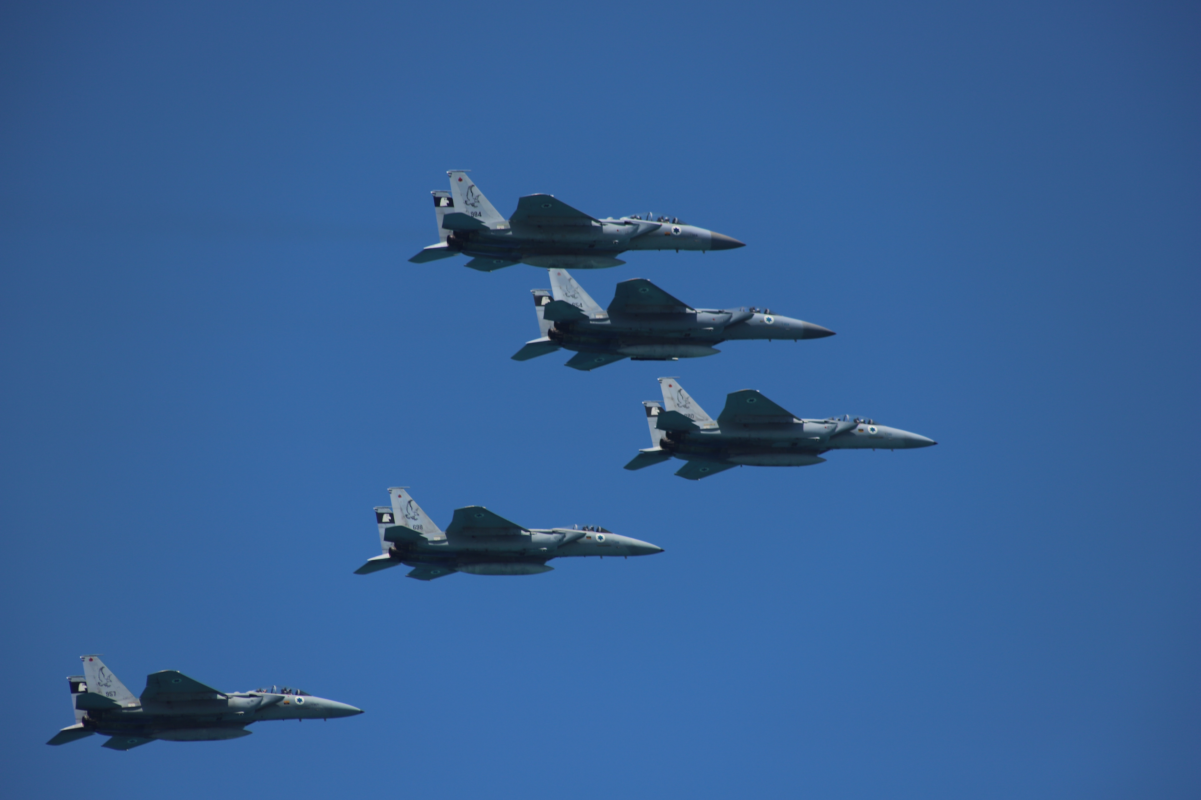 The second image shifts to a powerful, almost awe-inspiring scene. Four fighter jets from the Israeli Air Force soar in perfect formation against a clear blue sky. These sleek, grey aircraft cut through the sky, embodying the strength and precision of the Israeli military. Their formation demonstrates not just their technical superiority but the disciplined coordination that characterizes military might. The contrast between the calm, uninterrupted expanse of the sky and the speeding jets below is striking, as it highlights the duality of peace and defense.
