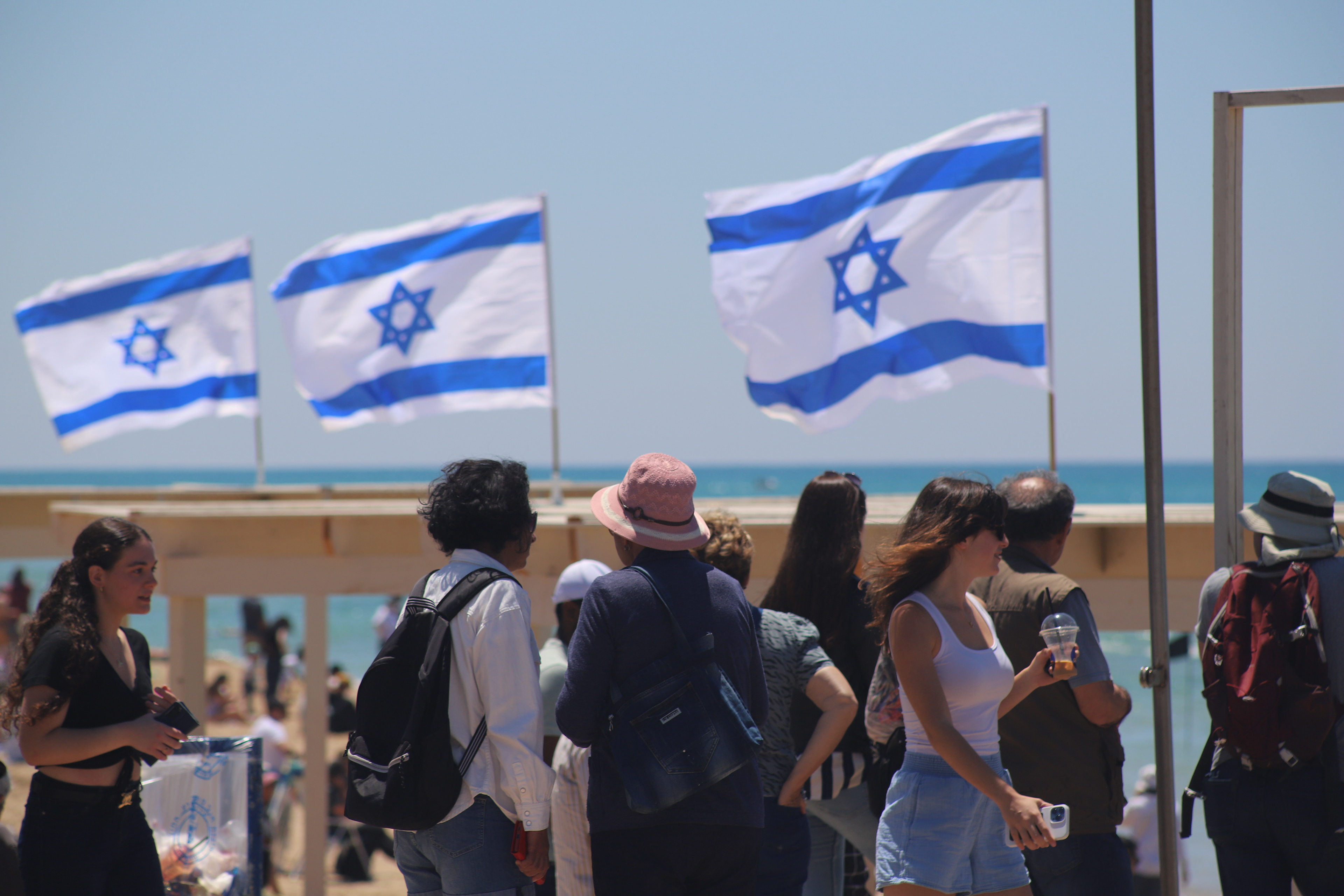 The first image, featuring a group of people gathered near the beach under the warm, sunlit sky, prominently displays several Israeli flags fluttering in the background. The flags, easily recognizable with their blue Star of David on a white field, serve as symbols of unity and national pride. The crowd below is diverse, with a mix of locals and tourists, some engaging in casual conversation while others are looking towards the shore. The turquoise sea, barely visible beyond the wooden structure, adds a serene touch to this vibrant moment of collective gathering.