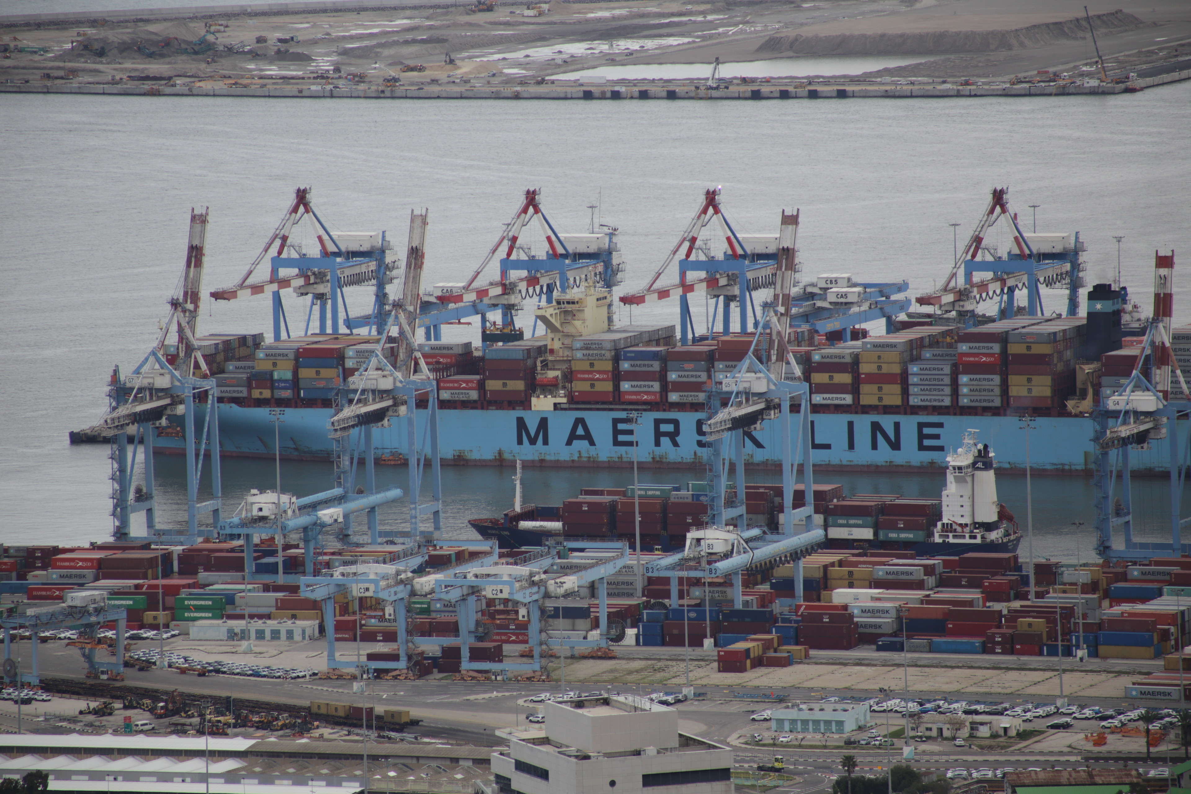 In the background, the port extends further with more cranes and an array of containers organized in neat stacks, emphasizing the efficiency and organization required to manage such vast quantities of cargo. The scene is framed by the distant shoreline, where construction equipment and partially developed land hint at ongoing expansion and development.