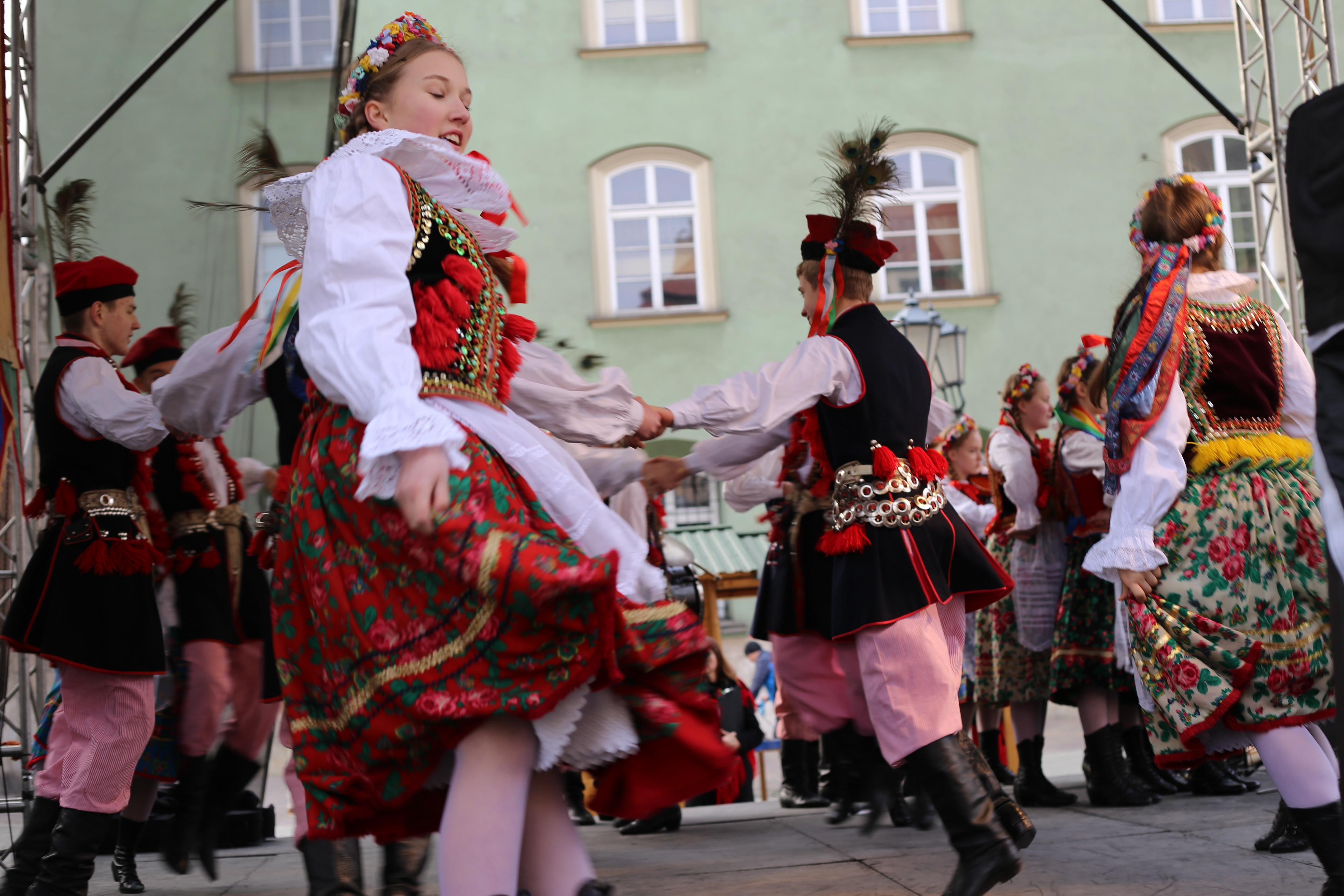 The image vividly captures a dynamic and lively traditional dance performance, making it a perfect visual centerpiece for MediaInstances.com, a platform envisioned to showcase diverse and culturally rich media content. The scene is filled with dancers dressed in elaborate and colorful traditional costumes, each garment intricately designed with vibrant patterns and adorned with detailed accessories. The dancers, both male and female, are immersed in their performance, holding hands as they whirl and twirl in a circular motion.