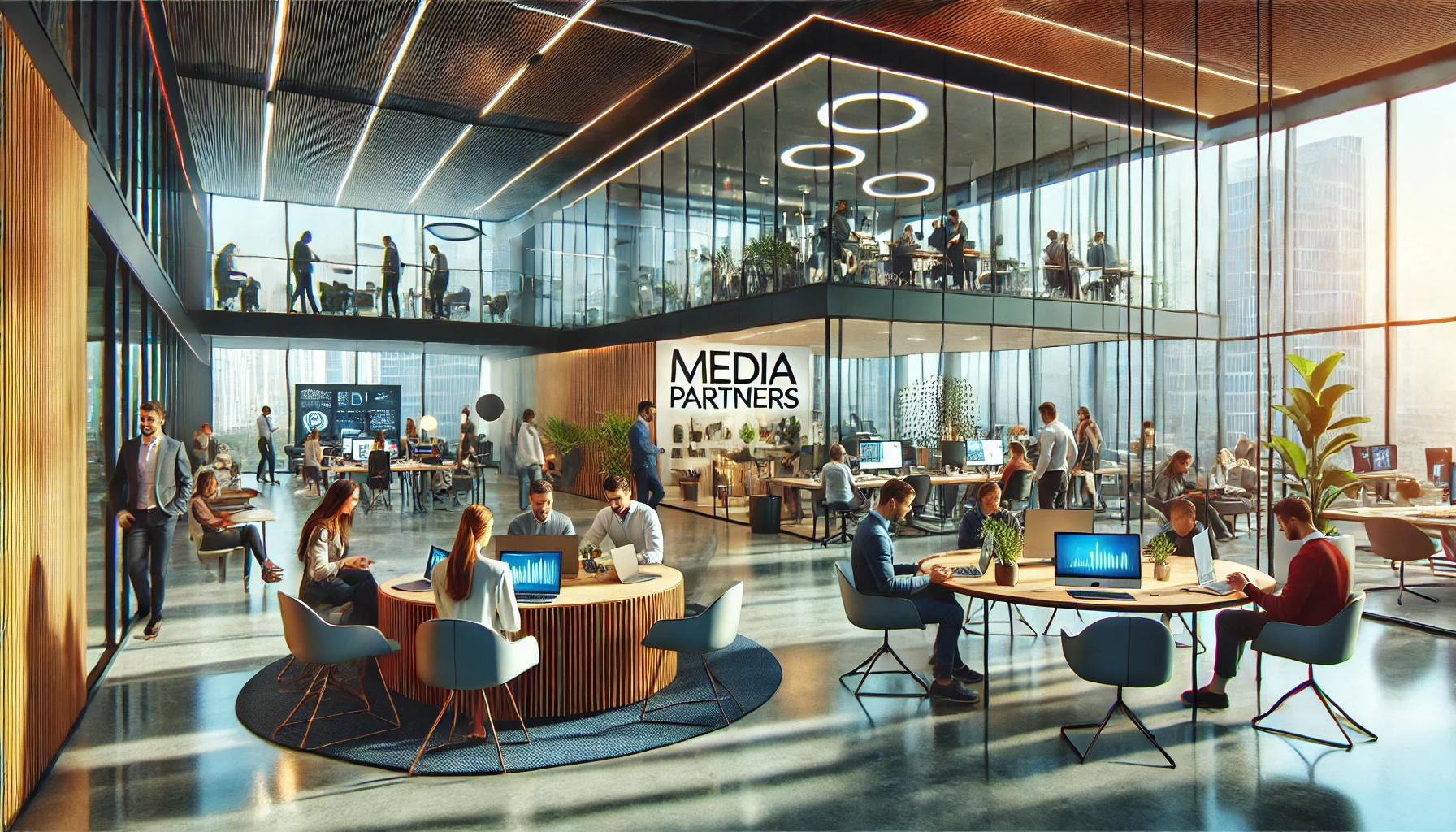 In this visual concept for Media Partners, the modern and sleek office space is immediately inviting with its large windows allowing an abundance of natural light to flood the room. The office is designed to foster collaboration, featuring round tables equipped with laptops, brainstorming boards, and comfortable chairs that encourage dynamic teamwork. Employees are seen engaging in discussions, working on computers, and collaborating on various projects, creating a lively and productive atmosphere. The vibrant colors and strategic use of greenery add a touch of nature, enhancing the overall environment. Prominently displayed near the entrance is a stylish reception desk with the 'Media Partners' logo, symbolizing innovation and professionalism at the core of the company's identity. This space captures the essence of a forward-thinking and collaborative media company.