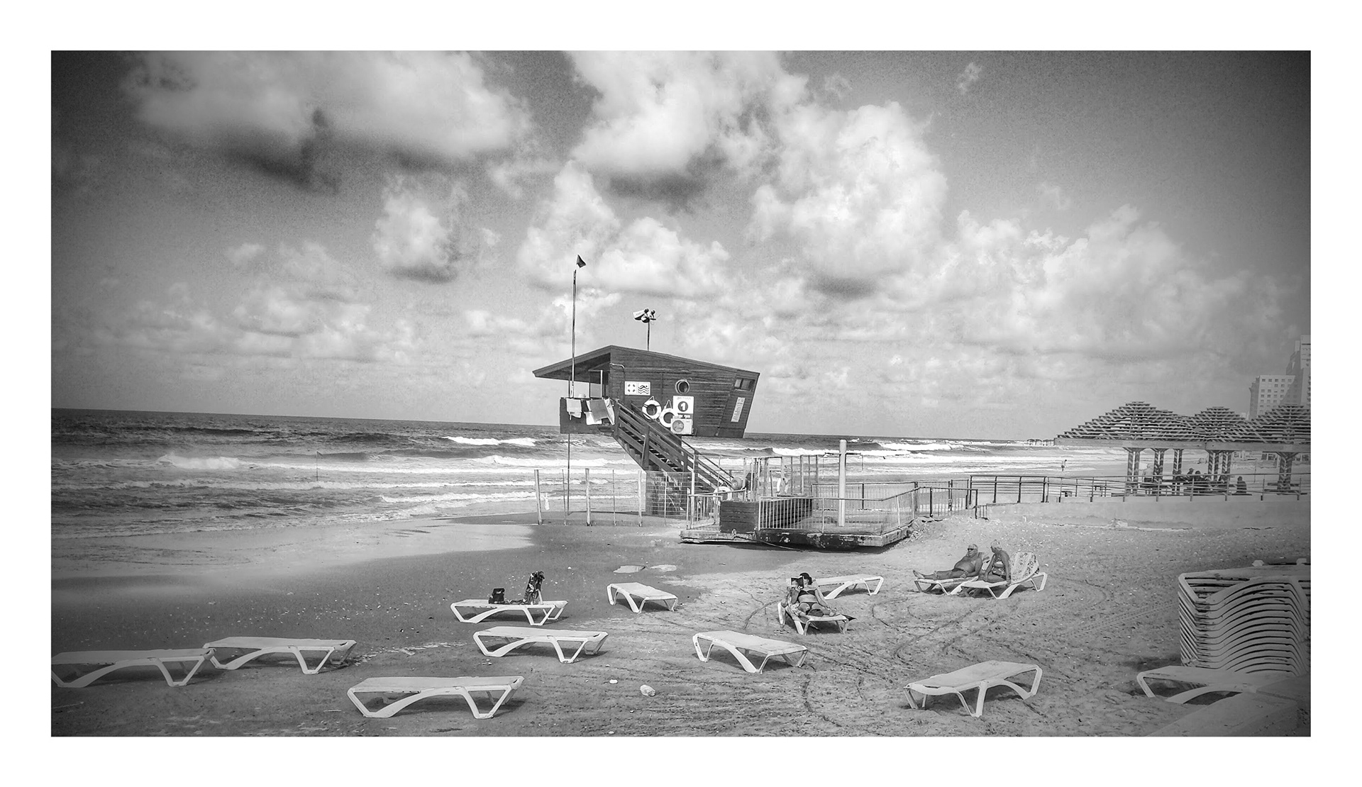 The foreground is populated with scattered, vacant sun loungers, their white frames stark against the grainy sand. Their seemingly haphazard arrangement evokes a sense of stillness, as though the peak of summer activity has passed, leaving behind the echoes of laughter and the creak of sunbeds shifting in the sand. Near the center, two figures are comfortably reclining, sunbathing or simply taking in the breeze, lending a human element to the otherwise spacious and minimalist scene. The distance between each sun lounger accentuates the openness of the beach, evoking a sense of privacy and quiet—a respite from the busier cityscape hinted at the edge of the horizon.