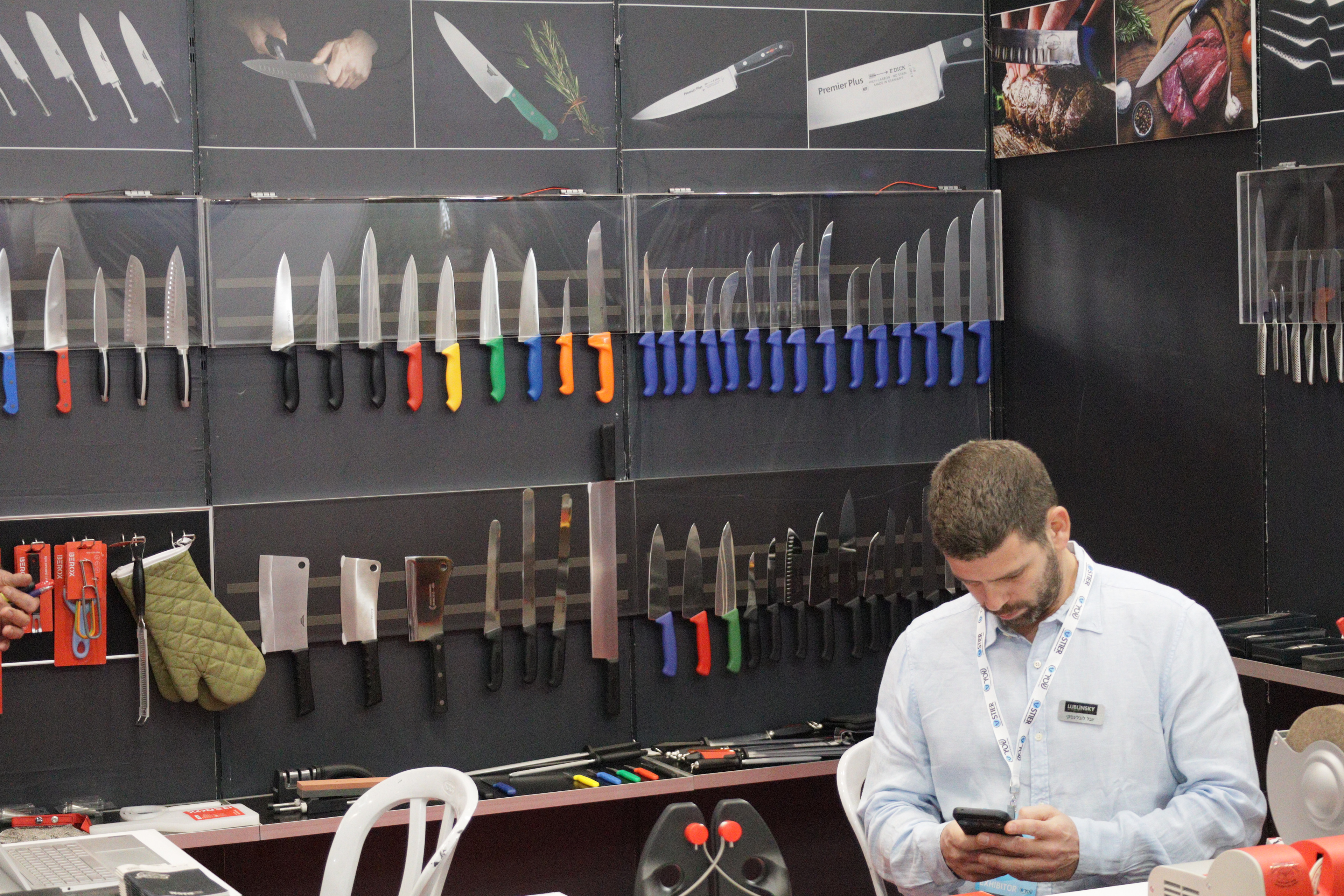There’s something a bit amusing about how perfectly fitting a name can be. Standing in front of this wall of knives — rows upon rows of blades aligned like a military review, handles in colors that feel almost playful against the cold precision of steel — the name SharpKnife.org suddenly feels inevitable. The scene is a mix of craftsmanship and quiet intensity: polished chef knives with tapered edges, serrated bread cutters, heavy meat cleavers, and that unmistakable glossy blue-handled lineup that stretches almost endlessly. Even the guy at the booth — absorbed in his phone, badge hanging loosely — feels like part of the modern marketplace rhythm: tools, trade, and tech all mashed together.