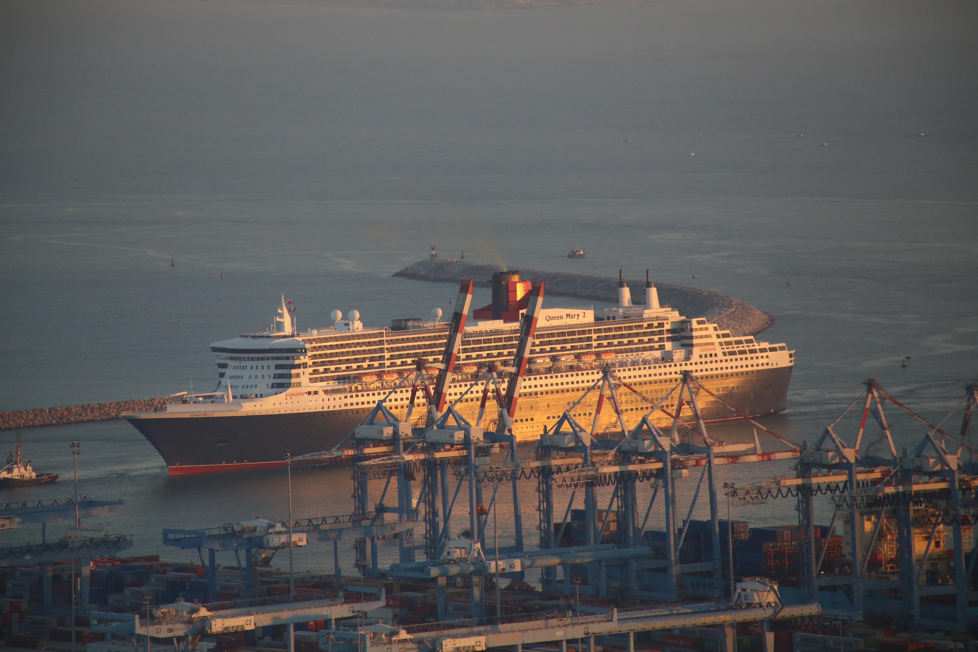 In the background, the calm waters extend towards the horizon, offering a serene contrast to the busy port. The small breakwater visible in the distance adds to the sense of tranquility, a reminder of the safety and stability that modern ports provide. This tranquil expanse of water invites viewers to imagine the open sea, the vastness of the ocean that the Queen Mary 2 will traverse on its voyages. The horizon, bathed in the warm glow of the setting sun, symbolizes endless possibilities and the allure of distant shores.